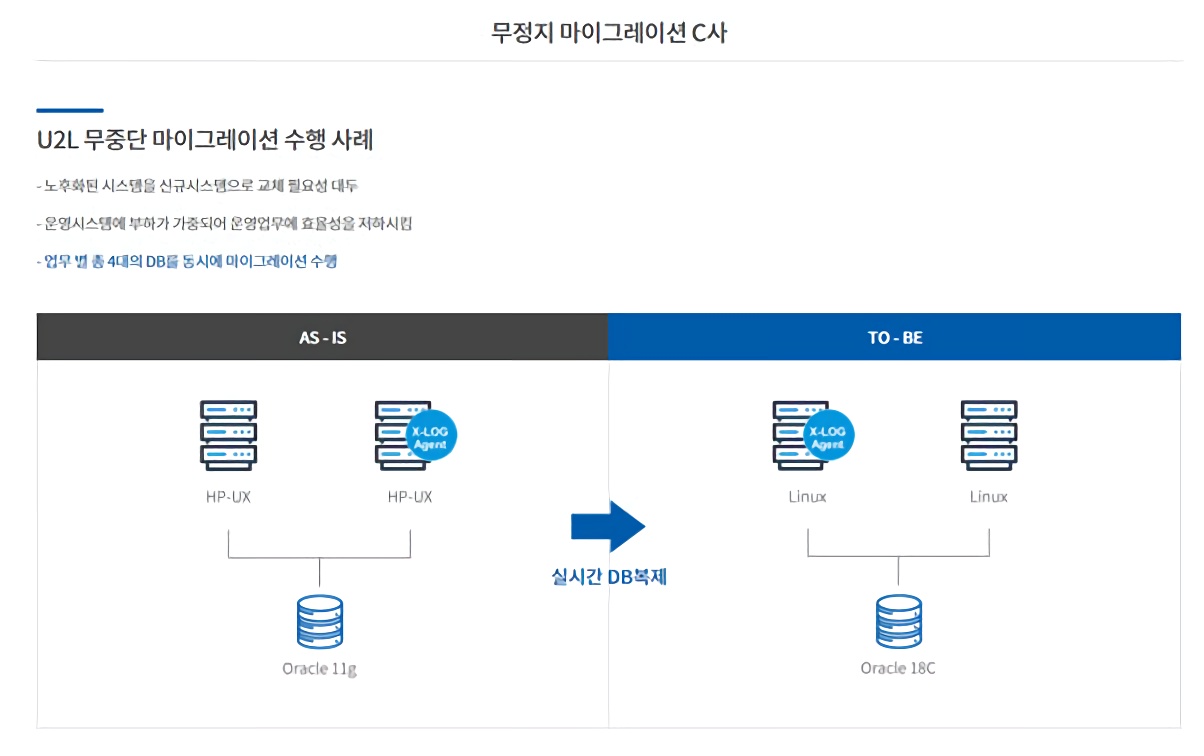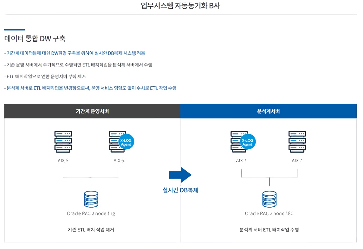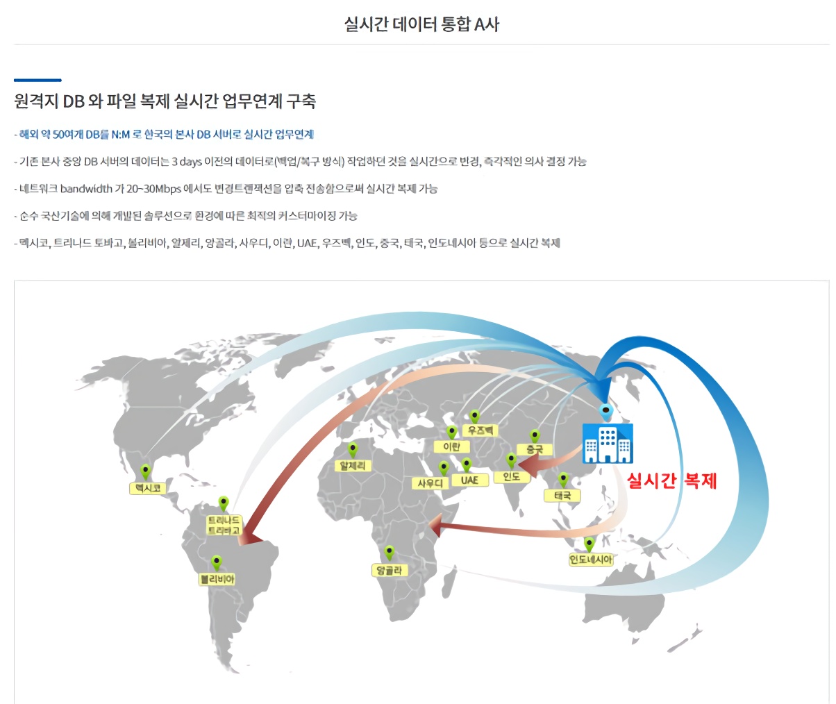 - 운영 중인 주서버에 추가 부하를 거의 주지 않고, 트랙잭션의 발생과 동시에 복제 서버로 데이터를 복제 하며, CDC(Change Data Capture) 방식의 전송으로 네트워크 사용량이 적으며 원거리 복제 시 네트워크 회선 비용을 대폭 절감할 수 있습니다.